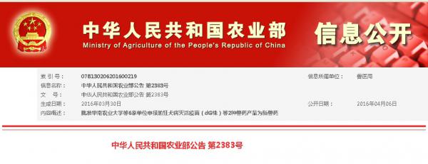 根據(jù)《獸藥管理?xiàng)l例》和《獸藥注冊辦法》規(guī)定,經(jīng)審查,批準(zhǔn)華南農(nóng)業(yè)大學(xué)等6家單位申報(bào)的狂犬病滅活疫苗(dG株)等2種獸藥產(chǎn)品為新獸藥,核發(fā)《新獸藥注冊證書》,并發(fā)布產(chǎn)品試行規(guī)程、質(zhì)量標(biāo)準(zhǔn)、說明書和標(biāo)簽,自發(fā)布之日起執(zhí)行。