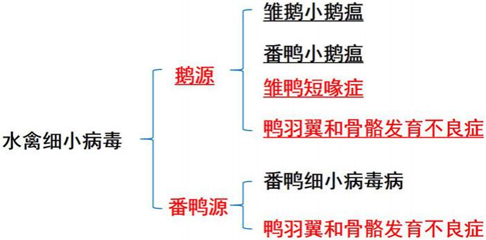 ①鵝源細(xì)小病毒GPV:感染鵝、番鴨和半番鴨。是最熟悉和常見的鵝/番鴨“小鵝瘟”和番鴨“三周病”病原。