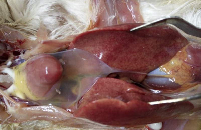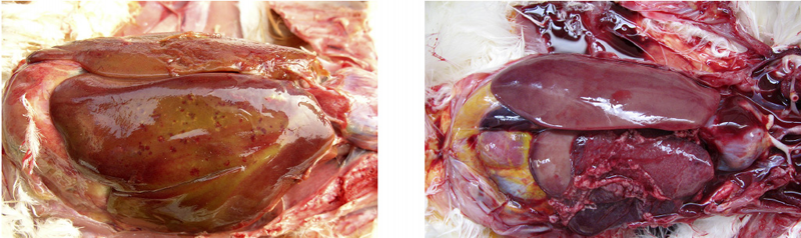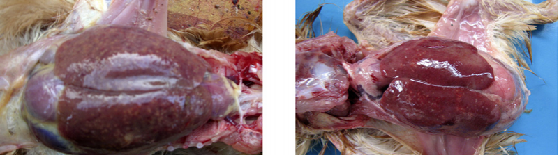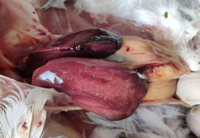 5、禽弧菌性肝炎:肝臟腫大,慢性病例在肝臟的表面和實(shí)質(zhì)內(nèi)有黃色、星芒狀的小壞死灶或布滿(mǎn)菜花狀的大壞死區(qū),急性病例肝臟被膜脫落肝臟出血,腹腔內(nèi)有多量血水。