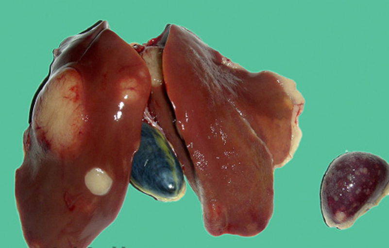 2、雞白痢:典型的病變?yōu)楦文[大表面可見(jiàn)多量點(diǎn)狀出血或灰白色針尖狀及小米粒樣壞死灶或灰白色增生性結(jié)節(jié)。